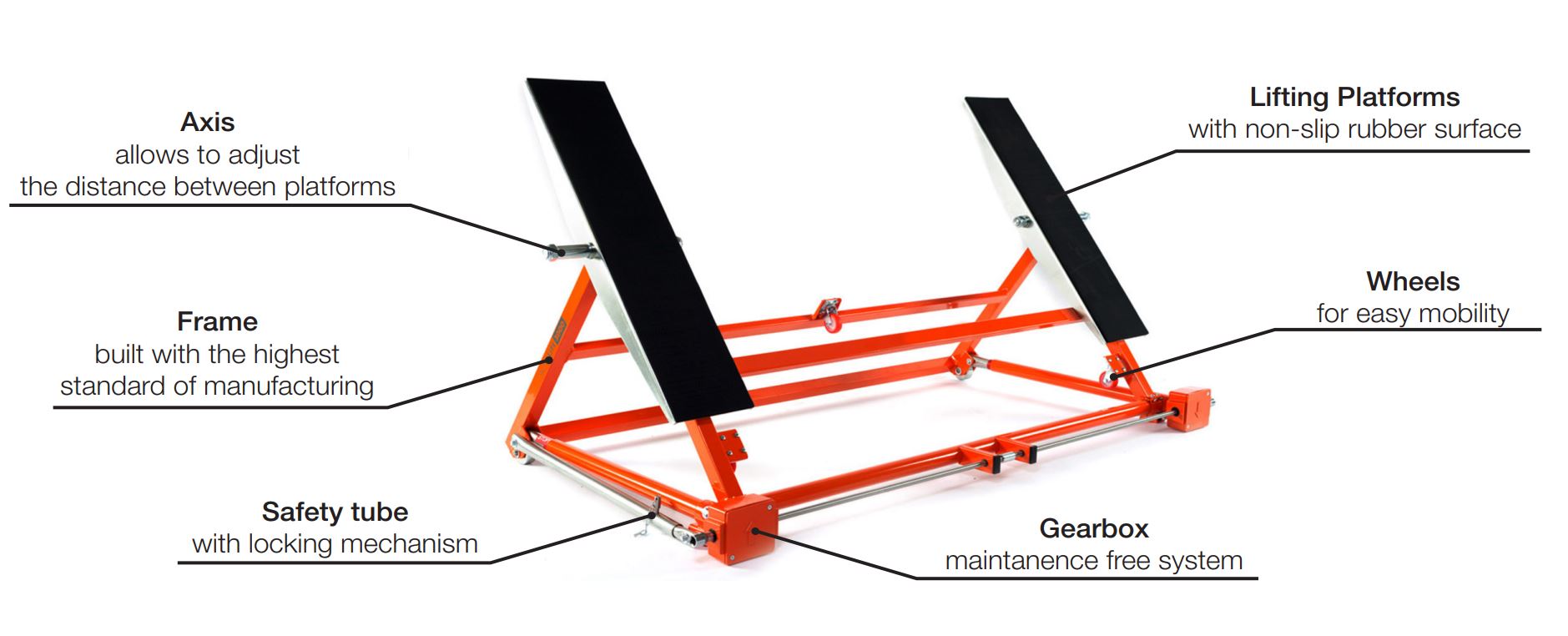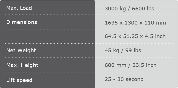 The AUTOLift3000 doesn’t rely on compressed air or electricity to raise and lower. With its completely maintenance-free mechanical gearbox, you can use the AUTOLift3000 anytime, anywhere, and on all most vehicles up to 3,000kg (6,614lbs).